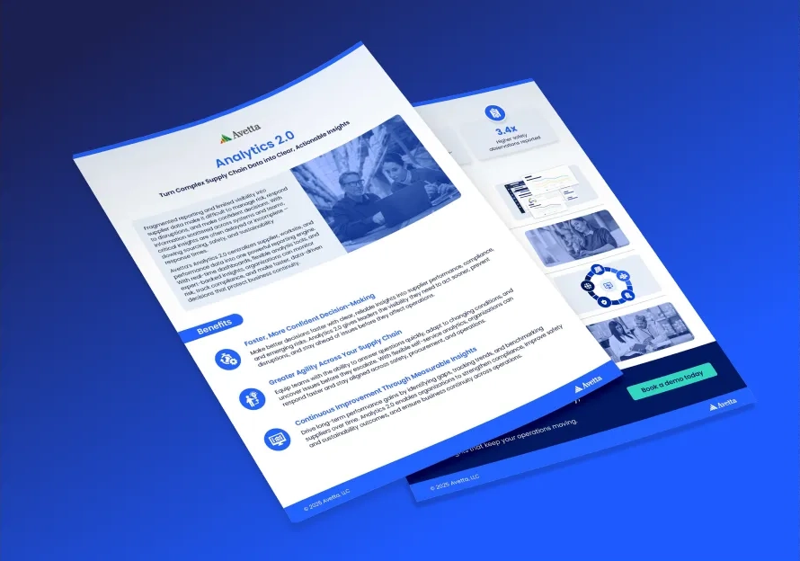 Avetta's Analytics 2.0 centralizes supplier, worksite, and performance data into a powerful insight engine. This solution delivers real-time dashboards and expert-backed insights to help you protect business continuity.