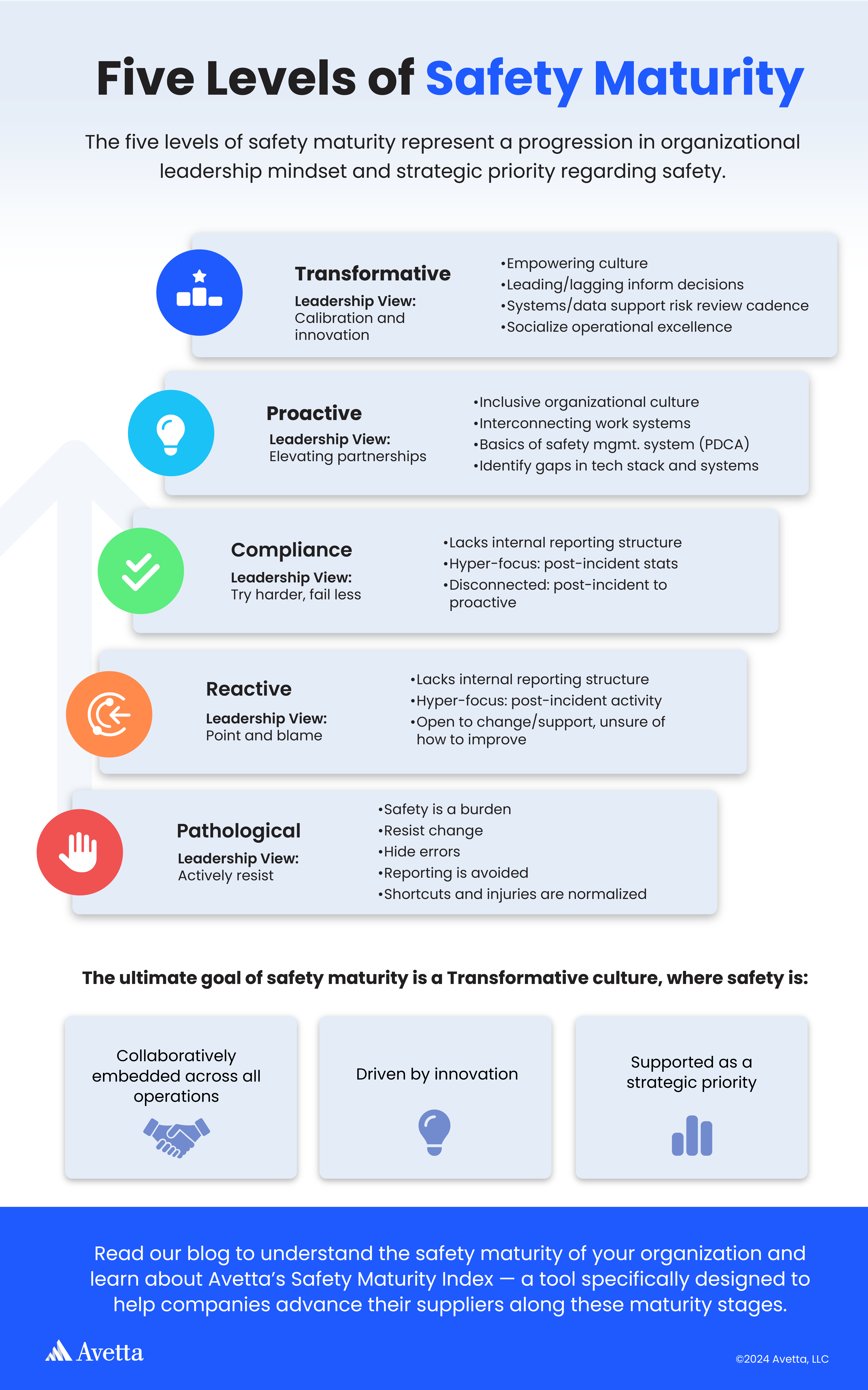 Knowing where your organization or supply chain stands, however, is only the beginning. In our next blog, we’ll introduce Avetta’s Safety Maturity Index — a tool specifically designed to help companies advance their suppliers along these maturity stages. Using leading indicators to identify gaps in safety practices, the index pinpoints areas where improvement is needed to reduce the occurrence of serious injuries and fatalities (SIFs). This maturity index offers a strategic approach to elevating your supply chain’s safety maturity, providing actionable insights that make transformative safety attainable.
